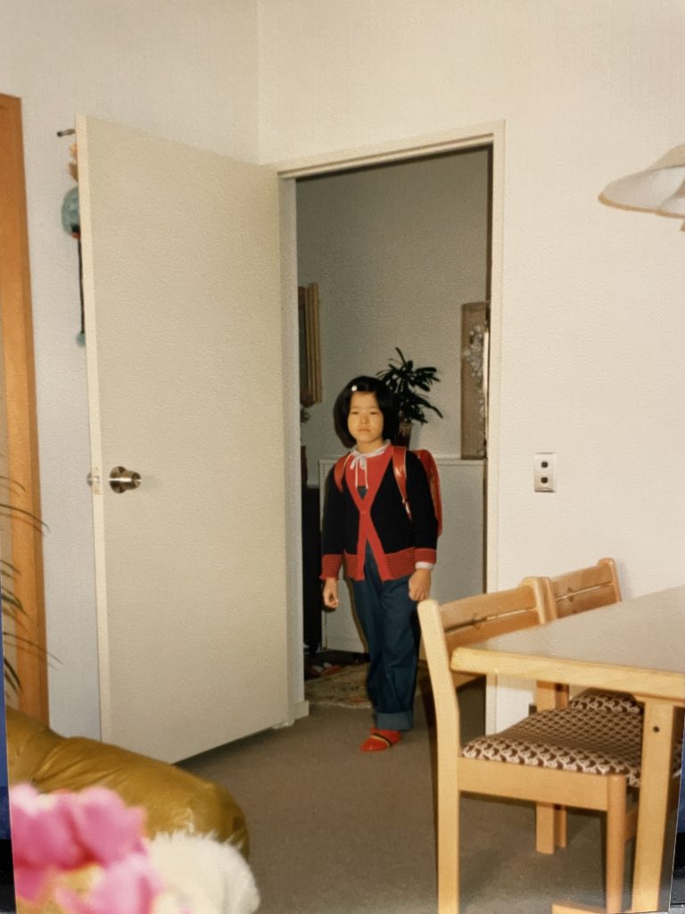 「はい、ランドセル置いてそこに座って~」とパシャリ。